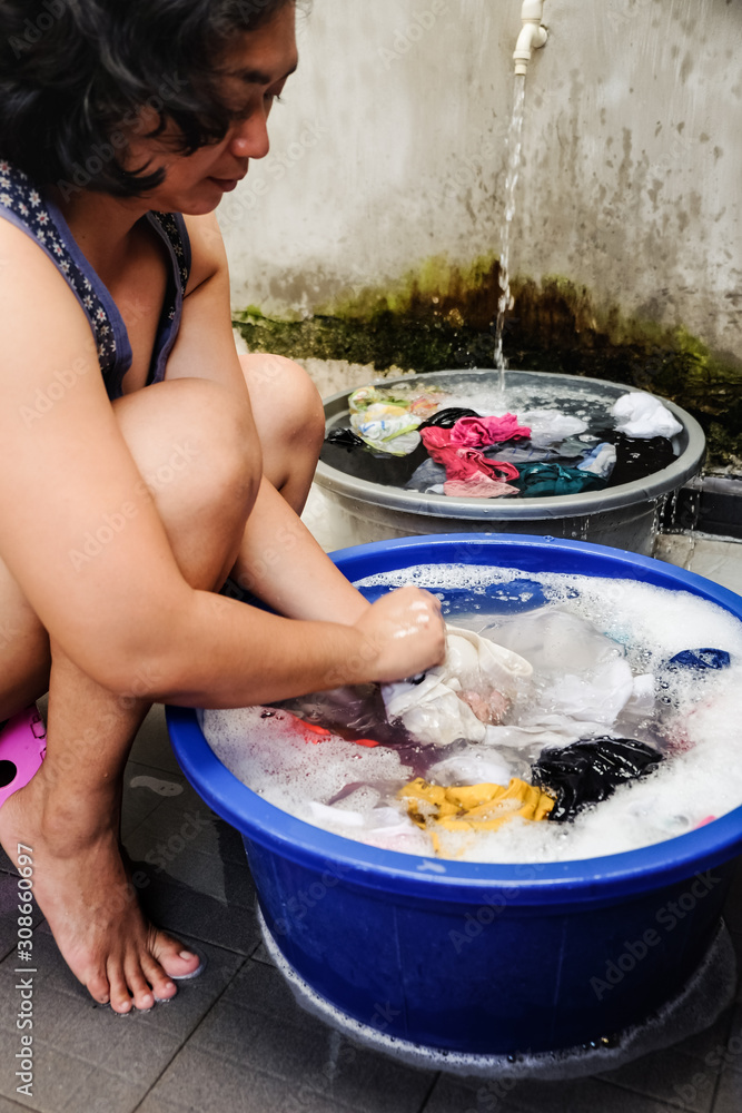 Asian Stay at Home Mother Doing Laundry Traditionally. Washing Very well made.
