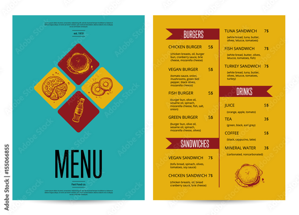Restaurant menu card design template. Vintage food layout junk Very well made.
