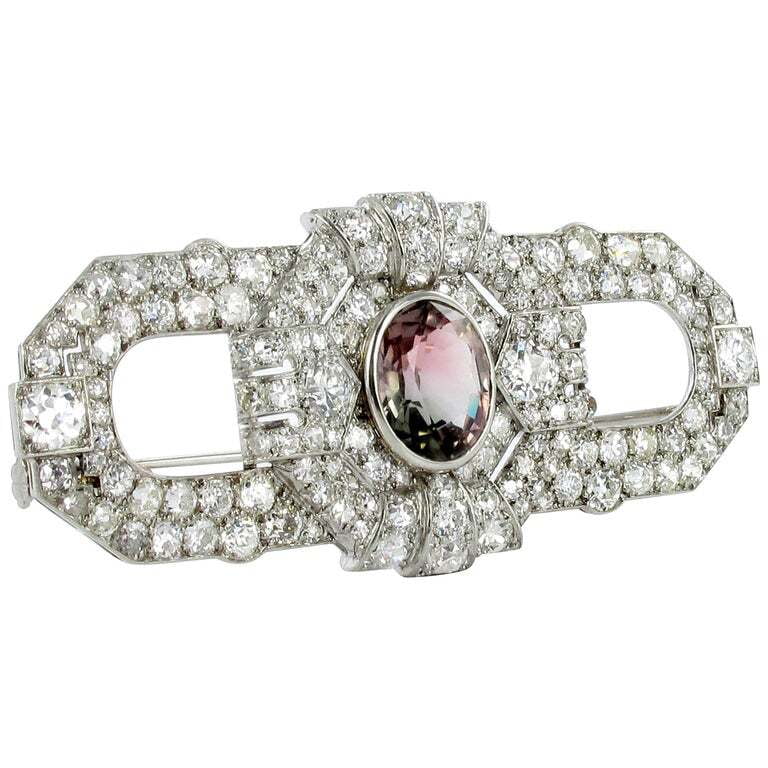 Art Deco Tourmaline and Diamond Platinum Brooch Very well made.