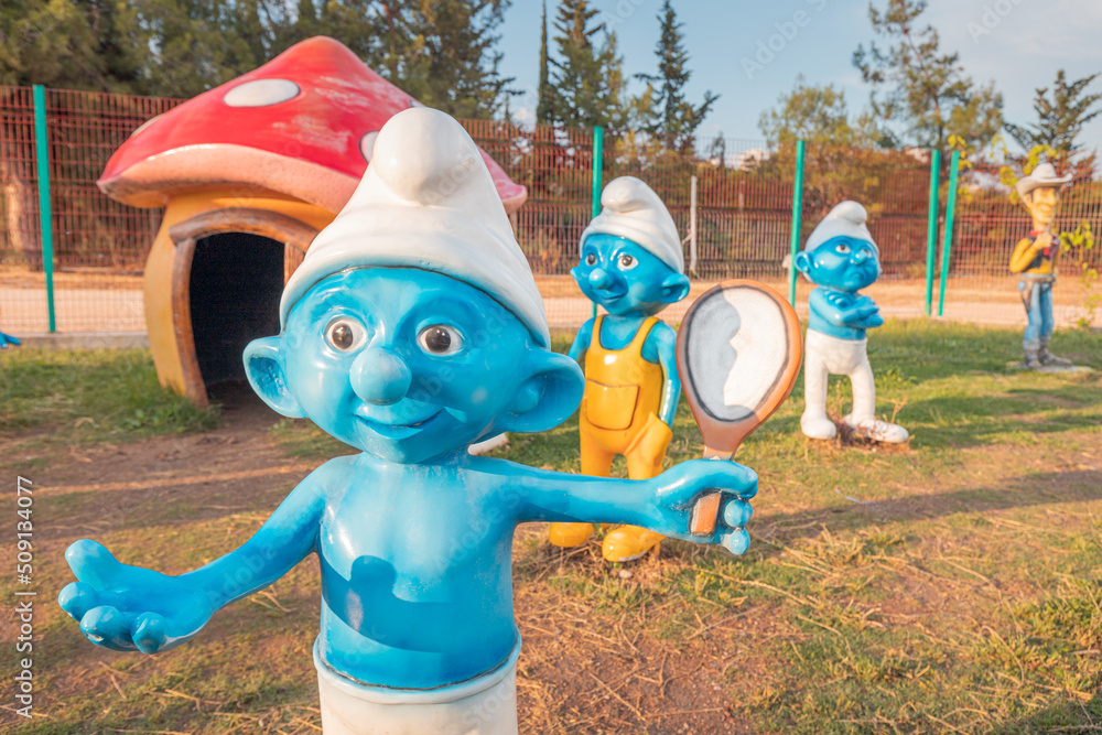19 May 2022 Antalya Turkey The Smurfs from belgian franchise in Very well made.