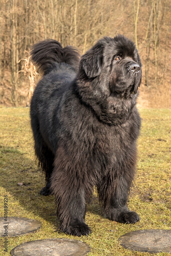 Big black dog. Newfoundland dog breed in an outdoor. Spring walk Very well made.