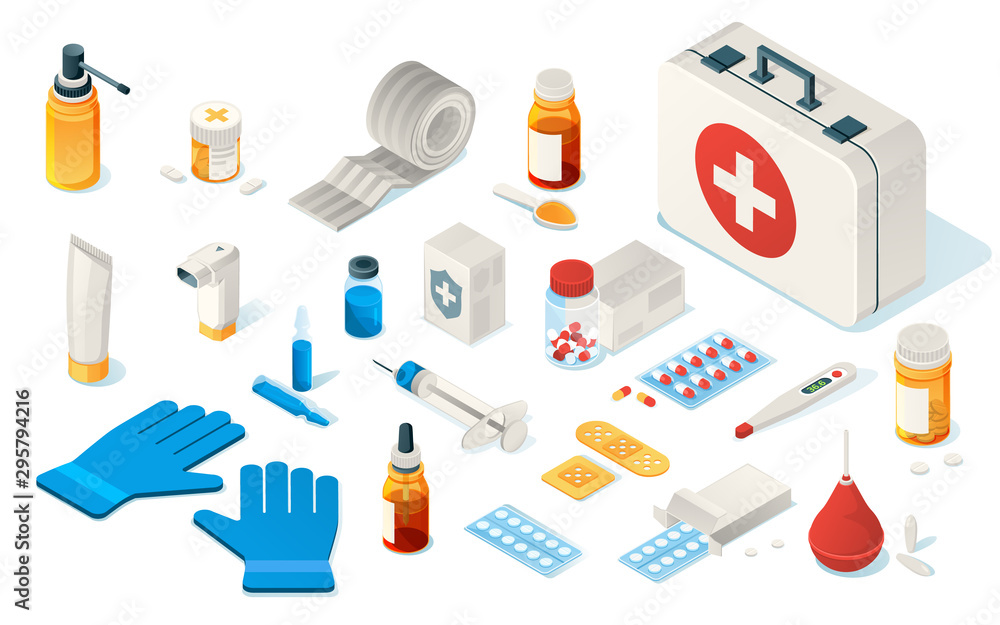 Set of isolated first aid kid tools or items of medical emergency Very well made.