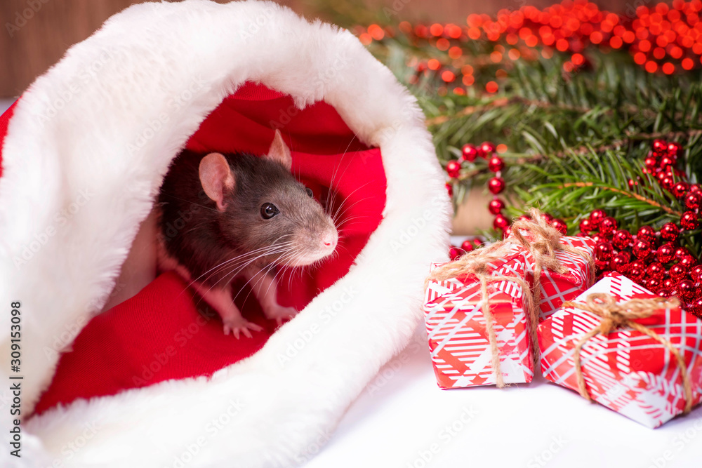 A little fluffy rat sits in a festive gift box. Christmas hat Very well made.